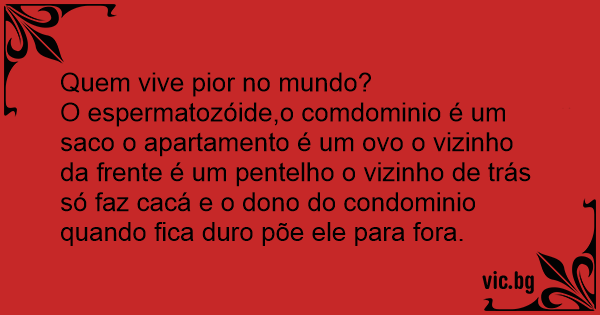 O espermatozóide,o comdominio é um saco o apartamento é um ovo o vizinho da frente é um pentelho o vizinho de trás só faz cacá e o dono do condominio quando fiса durо põe ele para fora.