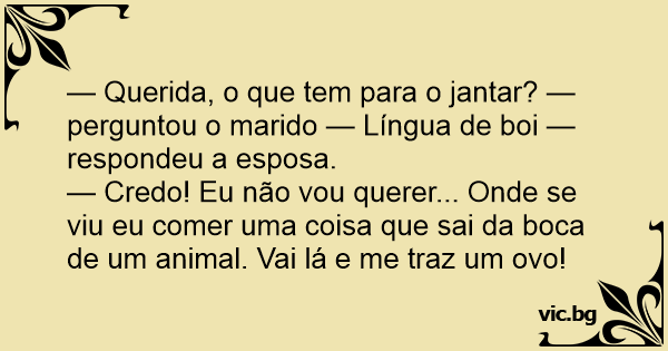 O Manoel chega do trabalho e diz: — Ô Manuela o que temos pra comer hoje? E ela diz: — Lingua ao molho madeira. Eca!!,eu lá vou comer uma coisa que estava na boca de um animal!!Frita um ovo pra mim.