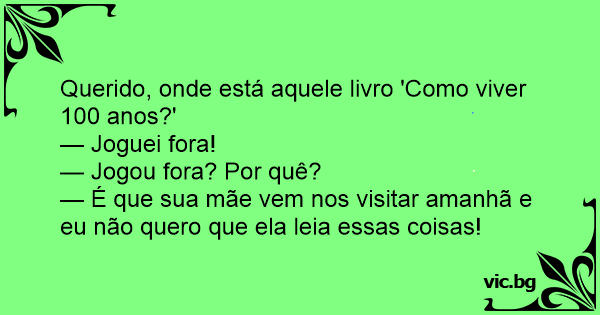 Carlos pergunta a sua mulher: — Querida você viu aquele livro COMO VIVER 100 ANOS -Não porque querido -É porque sua mãe vem aqui hoje e eu não quero que ela o veja