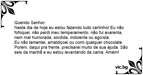 Eu não lamentei, amaldiçoei ou comi qualquer chocolate. Porém, daqui pra frente, precisarei muito de sua ajuda. São seis da manhã e eu estou levantando da cama. Amém!