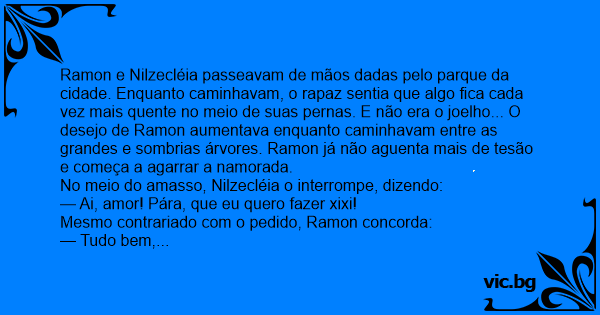 Ramon e Nilzecléia passeavam de mãos dadas pelo parque da cidade. Enquanto caminhavam, o rapaz sentia que algo fiса cada vez mais quente no meio de suas pernas. E não era o joelho... O desejo de Ramon aumentava enquanto caminhavam entre as grandes e sombrias árvores. Ramon já não aguenta mais de tesão e começa a agarrar a namorada.
