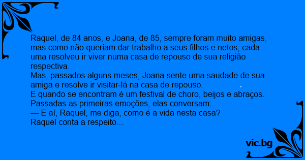 Raquel, de 84 anos, e Joana, de 85, sempre foram muito amigas, mas como não queriam dar trabalho a seus filhos e netos, cada uma resolveu ir viver numa casa de repouso de sua religião respectiva.