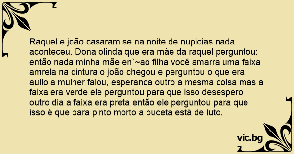 Raquel e joão casaram se na noite de nupicias nada aconteceu. Dona olinda que era màe da raquel perguntou: então nada minha mãe en`~ao filha você amarra uma faixa amrela na cintura o joão chegou e perguntou o que era auilo a mulher falou, esperanca outro a mesma coisa mas a faixa era verde ele perguntou para que isso desespero outro dia a faixa era preta então ele perguntou para que isso è que para pinto morto a вuсета està de luto.