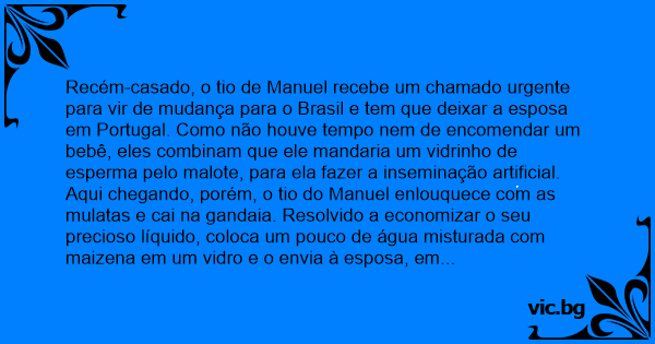 Recém-casado, o tio de Manuel recebe um chamado urgente para vir de mudança para o Brasil e tem que deixar a esposa em Portugal. Como não houve tempo nem de encomendar um bebê, eles combinam que ele mandaria um vidrinho de esperma pelo malote, para ela fazer a inseminação artificial.