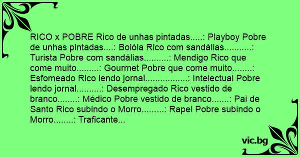 RICO x POBRE Rico de unhas pintadas.....: Рlаyвоy Pobre de unhas pintadas....: Boióla Rico com sandálias...........: Turista Pobre com sandálias..........: Mendigo Rico que come muito.........: Gourmet Pobre que come muito........: Esfomeado Rico lendo jornal.................: Intelectual Pobre lendo jornal..........: Desempregado Rico vestido de branco........: Médico Pobre vestido de branco.......: Pai de Santo Rico subindo o Morro.........: Rapel Pobre subindo o Morro........: Traficante Rico em restaurante...........: Cliente Pobre em restaurante..........: Garçom Rico de terno.................: Empresário Pobre de terno................: Defunto Rico na loja..............: Quanto custa?