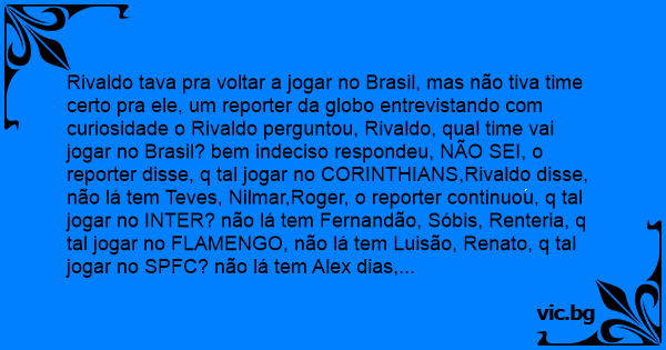 Rivaldo tava pra voltar a jogar no Brasil, mas não tiva time certo pra ele, um reporter da globo entrevistando com curiosidade o Rivaldo perguntou, Rivaldo, qual time vai jogar no Brasil? bem indeciso respondeu, NÃO SEI, o reporter disse, q tal jogar no CORINTHIANS,Rivaldo disse, não lá tem Teves, Nilmar,Roger, o reporter continuou, q tal jogar no INTER? não lá tem Fernandão, Sóbis, Renteria, q tal jogar no FLAMENGO, não lá tem Luisão, Renato, q tal jogar no SPFC? não lá tem Alex dias, Grafite,,,,,,,,,,,O REPORTER FICOU FURIOSO E DISSE: vai te catar preguisoço, mercenário, VAI A МЕRDА, RIVALDO RESPONDEU? NÃO...... LÁ TEM LUCAS, PATRÍCIO, RICARDINHO, MANO MENEZES E ETC.