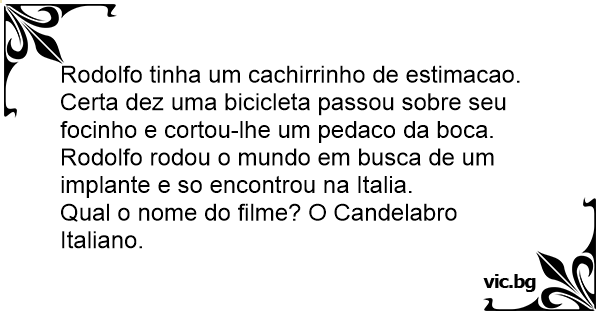 Rodolfo tinha um cachirrinho de estimacao. Certa dez uma bicicleta passou sobre seu focinho e cortou-lhe um pedaco da boca. Rodolfo rodou o mundo em busca de um implante e so encontrou na Italia.