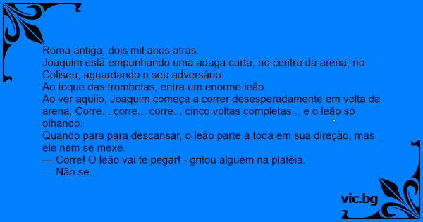 Ao ver aquilo, Joaquim começa a correr desesperadamente em volta da arena. Corre... corre... corre... cinco voltas completas... e o leão só olhando.