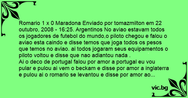 Romario 1 x 0 Maradona Enviado por tomazmilton em 22 outubro, 2008 - 16:25. Argentinos No aviao estavam todos os jogadores de futebol do mundo,o piloto chegou e falou o aviao esta caindo e disse temos que joga todos os pesos que temos no aviao. ai todos jogaram seus equipamentos o piloto voltou e disse que nao adiantou nada .