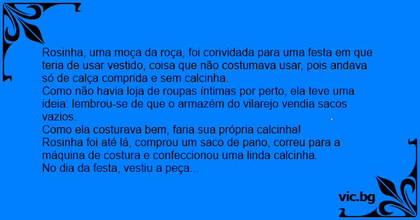 Rosinha foi até lá, comprou um saco de pano, correu para a máquina de costura e confeccionou uma linda calcinha.