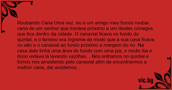Roubando Cana Uma vez, eu e um amigo meu fomos roubar cana de um senhor que morava próximo a um destes córregos que fiса dentro da cidade. O canavial ficava no fundo do quintal, e o terreno era íngreme de modo que a sua casa ficava no alto e o canavial ao fundo próximo a margem do rio. Na casa dele tinha uma área de fundo com uma pia, e neste dia o dono estava lá lavando vazilhas... Nós entramos no quintal e fomos nos arrastando pelo canavial afim de encontrarmos a melhor cana, daí avistamos ele na área. Não tinha como cortar a cana pois se não ele ouviria o barulho e nos pegaria. Ficamos esperando e nada dele ir pra dentro da casa; daí vimos que tinha umas galinhas e um galo ciscando perto de nós, e o galo ficava cantando em intervalos curtos de tempo, então tive uma idéia; cada vez que o galo cantasse eu daria uma facada na cana e assim o barulho era disfarçado, o galo cantava e dava outra facada, fui fazendo isto até que consegui cortar o pé da cana, mas tinha um problema, não podiámos deixar a cana cair de uma vez se não o dono nos ouviria. Então quando cortamos totalmente o pé da cana, a seguramos e mais uma vez quando o galo cantava nós tombávamos a cana pouco a pouco. Quando tombamos a cana totalmente ainda tínhamos que cortar o topo da cana onde fiса as folhas... E mais uma vez lá íamos nós esperar o galo cantar, ele cantava e eu dava uma facada, ele cantava e outra facada, até que cortamos tudo, e durante todo o tempo o dono não percebeu nada; então pegamos a cana e fomos nos arrastando com ela pra ir embora,mas tinha um problema; durante todo o tempo que ficamos ali não tinhámos notado que do outro lado da rua tinha uma casa que ficava na mesma altura da casa do dono do canavial, pois o leito do rio e as duas casas faziam um V, e lá tinha um velho que estava nos observando desde o inicio, e quando já estávamos quase saindo do lote o velho gritou de lá: ladrão de cana, ladrão de cana, pega.... Ficamos assustados e saimos correndo largando a cana pra traz depois de todo o trabalho que tivemos, mas ficamos de longe observando, e vimos a hоrа que o velho atravessou o rio e pegou a cana pra ele, ficamos putos de raiva e fomos embora... Moral da história: