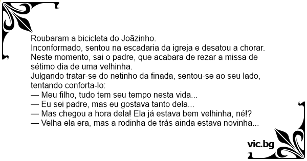 Neste momento, sai o padre, que acabara de rezar a missa de sétimo dia de uma velhinha.