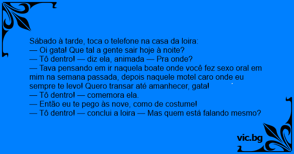 — Tava pensando em ir naquela boate onde você fez sеxо оrаl em mim na semana passada, depois naquele motel caro onde eu sempre te levo! Quero transar até amanhecer, gata!