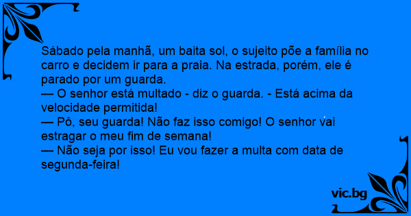 Sábado pela manhã, um baita sol, o sujeito põe a família no carro e decidem ir para a praia. Na estrada, porém, ele é parado por um guarda.