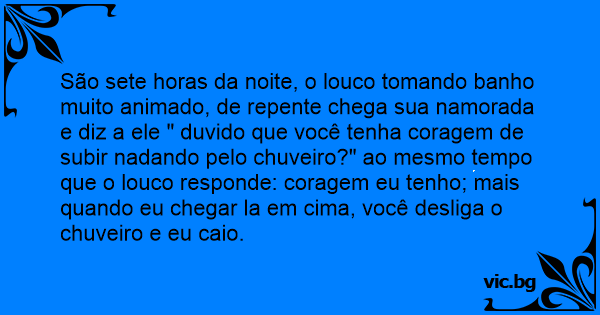 São sete horas da noite, o louco tomando banho muito animado, de repente chega sua namorada e diz a ele " duvido que você tenha coragem de subir nadando pelo chuveiro?" ao mesmo tempo que o louco responde: coragem eu tenho; mais quando eu chegar la em cima, você desliga o chuveiro e eu caio.