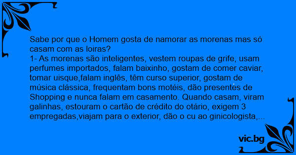 1- As morenas são inteligentes, vestem roupas de grife, usam perfumes importados, falam baixinho, gostam de comer caviar, tomar uisque,falam inglês, têm curso superior, gostam de música clássica, frequentam bons motéis, dão presentes de Shopping e nunca falam em casamento. Quando casam, viram galinhas, estouram o cartão de crédito do otário, exigem 3 empregadas,viajam para o exterior, dão o cu ao ginicologista, pintam o cabelo de loiro se fazem de burras e pedem o divórcio.