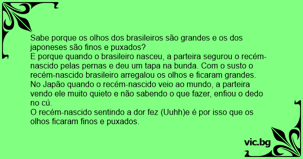 E porque quando o brasileiro nasceu, a parteira segurou o recém-nascido pelas pernas e deu um tapa na bunda. Com o susto o recém-nascido brasileiro arregalou os olhos e ficaram grandes.