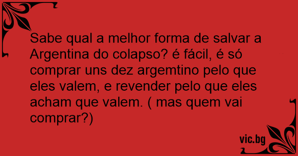 Sabe qual a melhor forma de salvar a Argentina do colapso? é fácil, é só comprar uns dez argemtino pelo que eles valem, e revender pelo que eles acham que valem. ( mas quem vai comprar?)