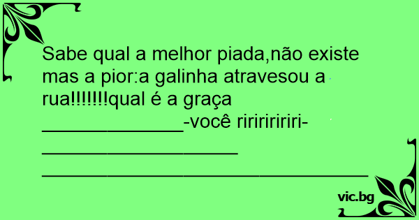 Sabe qual a melhor piada,não existe mas a pior:a gаlinhа atravesou a rua!!!!!!!qual é a graça _____________-você riririririri-__________________ ______________________________________________________________________________________________________________________________________________________