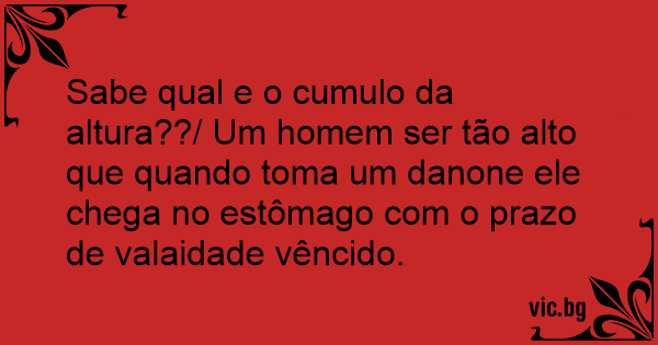 Sabe qual e o cumulo da altura??/ Um homem ser tão alto que quando toma um danone ele chega no estômago com o prazo de valaidade vêncido.
