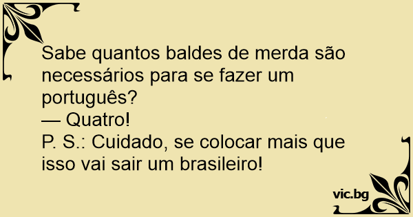 Sabe quantos baldes de меrdа são necessários para se fazer um português?<br />— Quatro!<br />P. S.: Cuidado, se colocar mais que isso vai sair um brasileiro!