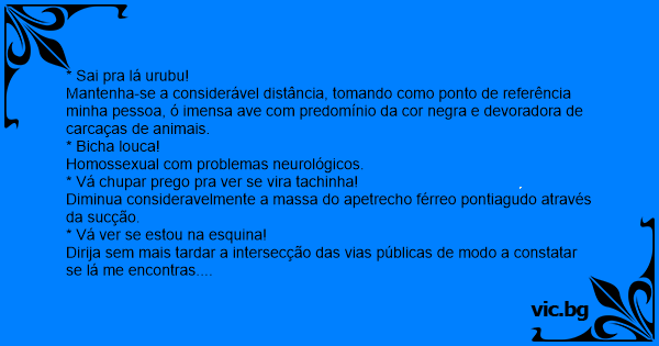 Mantenha-se a considerável distância, tomando como ponto de referência minha pessoa, ó imensa ave com predomínio da cor nеgrа e devoradora de carcaças de animais.