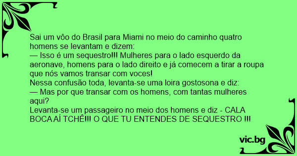 — Isso é um sequestro!!! Mulheres para o lado esquerdo da aeronave, homens para o lado direito e já comecem a tirar a roupa que nós vamos transar com voces!