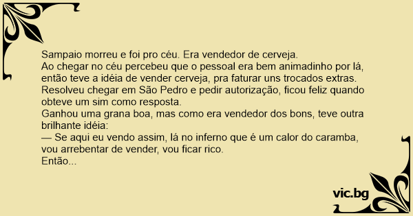 Ao chegar no céu percebeu que o pessoal era bem animadinho por lá, então teve a idéia de vender cerveja, pra faturar uns trocados extras.