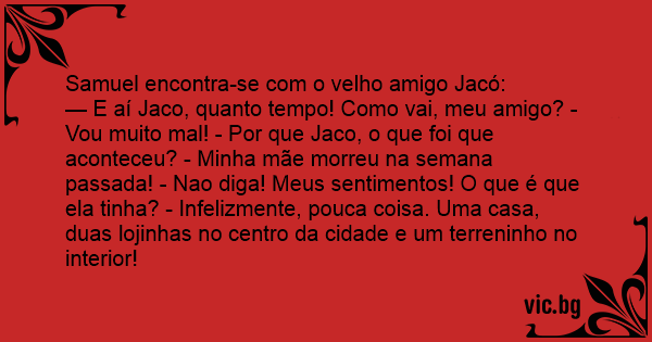 — E aí Jaco, quanto tempo! Como vai, meu amigo? - Vou muito mal! - Por que Jaco, o que foi que aconteceu? - Minha mãe morreu na semana passada! - Nao diga! Meus sentimentos! O que é que ela tinha? - Infelizmente, pouca coisa. Uma casa, duas lojinhas no centro da cidade e um terreninho no interior!