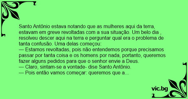 Santo Antônio estava notando que as mulheres aqui da terra, estavam em greve revoltadas com a sua situação. Um belo dia , resolveu descer aqui na terra e perguntar qual era o problema de tanta confusão. Uma delas começou: