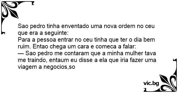 — Sao pedro me contaram que a minha mulher tava me traindo, entaum eu disse a ela que iria fazer uma viagem a negocios,so