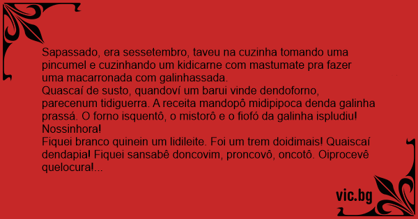 Sapassado, era sessetembro, taveu na cuzinha tomando uma pincumel e cuzinhando um kidicarne com mastumate pra fazer uma macarronada com galinhassada.