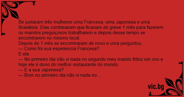 Se juntaram três mulheres uma Francesa, uma Japonesa e uma Brasileira. Elas combinaram que ficariam de greve 1 mês para fazerem os maridos preguiçosos trabalharem e depois desse tempo se encomtrarem no mesmo local.