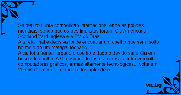 Se realizou uma competicao internacional entre as policias mundiais, sendo que os tres finalistas foram, Cia Americana, Scotland Yard Inglesa e a PM do Brasil.