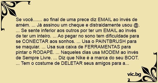 Se você....... ao final de uma prece diz EMAIL ao invés de amém. ... Já assinou um cheque e distraidamente usou @. ... Se sente inferior aos outros por ter um EMAIL ao invés de ter um inteiro. ... Ao pegar no sono tem dificuldade para se CONECTAR aos sonhos. ... Usa o PAINTBRUSH para se maquiar. ... Usa sua caixa de FERRAMENTAS para pintar o RODAPÉ. ... Naqueles dias usa MODEM ao invés de Sempre Livre. ... Diz que Nike é a marca do seu BOOT. ... Tem o costume de DELETAR seus amigos para a polícia. ... Para pegar um táxi vai ao PONTO COM. BR. ... Anda com MEMÓRIA de RAM. ... Vive abrindo suas JANELAS. ... Já fez um C*URSOR para vestibular. ... Para chegar em casa está sempre usando um ATALHO. ... Costuma preferir o MOUSE ao invés de um bom mousse. .... Costuma ver SPAMtalho no seu quarto. ... Só sabe beber água da FONTE. ... Consegue provocar um curto no seu PAINEL DE CONTROLE. ... Mantém a sua ÁREA DE TRABALHO sempre limpa. ... Prefere um Cheese BUG ao invés de um Cheese Burger. Minha amiga!!! Meu amigo!!! Parabéns!!! Você é ser um internauta!!!