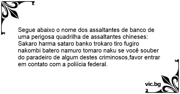 Sakaro harma sataro banko trokaro tiro fugiro nakombi batero namuro tomaro naku se você souber do paradeiro de algum destes criminosos,favor entrar em contato com a poliícia federal.
