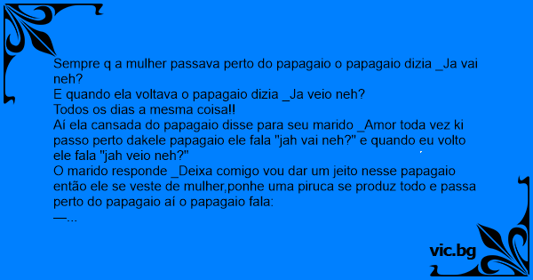 Aí ela cansada do papagaio disse para seu marido _Amor toda vez ki passo perto dakele papagaio ele fala "jah vai neh?" e quando eu volto ele fala "jah veio neh?"
