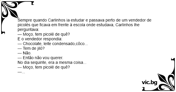 Sempre quando Carlinhos ia estudar e passava perto de um vendedor de picolés que ficava em frente à escola onde estudava, Carlinhos lhe perguntava: