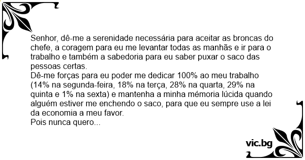 Dê-me forças para eu poder me dedicar 100% ao meu trabalho (14% na segunda-feira, 18% na terça, 28% na quarta, 29% na quinta e 1% na sexta) e mantenha a minha mémoria lúcida quando alguém estiver me enchendo o saco, para que eu sempre use a lei da economia a meu favor.