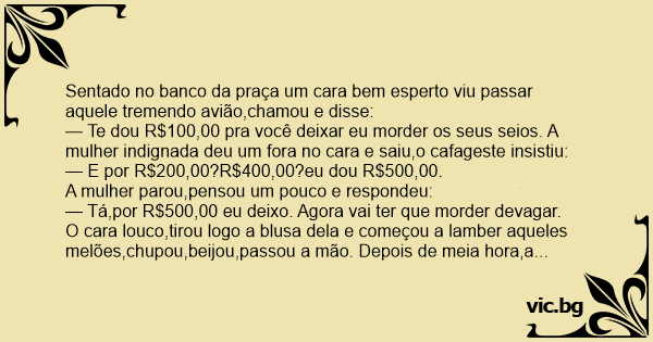 — Te dou R$100,00 pra você deixar eu morder os seus seios. A mulher indignada deu um fora no cara e saiu,o cafageste insistiu:
