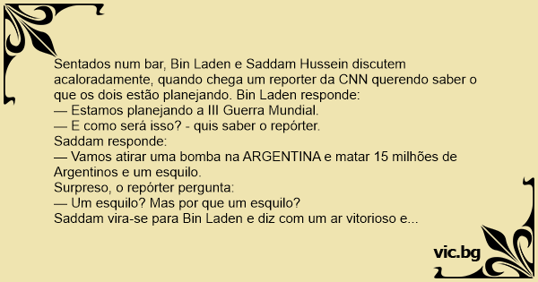 Sentados num bar, Bin Laden e Saddam Hussein discutem acaloradamente, quando chega um reporter da CNN querendo saber o que os dois estão planejando. Bin Laden responde: