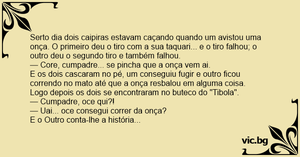 Serto dia dois caipiras estavam caçando quando um avistou uma onça. O primeiro deu o tiro com a sua taquari... e o tiro falhou; o outro deu o segundo tiro e também falhou.