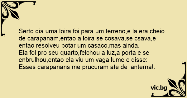 Serto dia uma loira foi para um terreno,e la era cheio de carapanam,entao a loira se cosava,se csava,e entao resolveu botar um casaco,mas ainda.