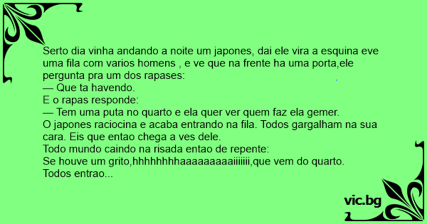 Serto dia vinha andando a noite um japones, dai ele vira a esquina eve uma fila com varios homens , e ve que na frente ha uma porta,ele pergunta pra um dos rapases: