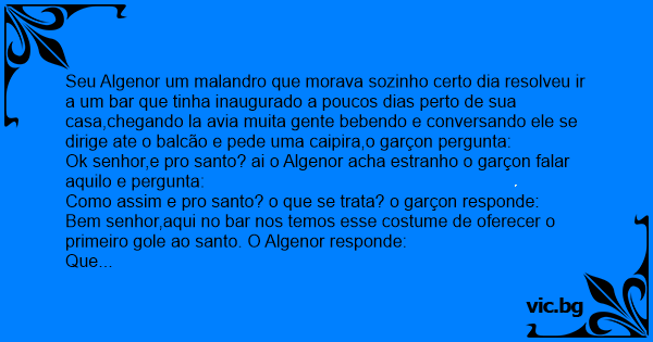 Seu Algenor um malandro que morava sozinho certo dia resolveu ir a um bar que tinha inaugurado a poucos dias perto de sua casa,chegando la avia muita gente bebendo e conversando ele se dirige ate o balcão e pede uma caipira,o garçon pergunta: