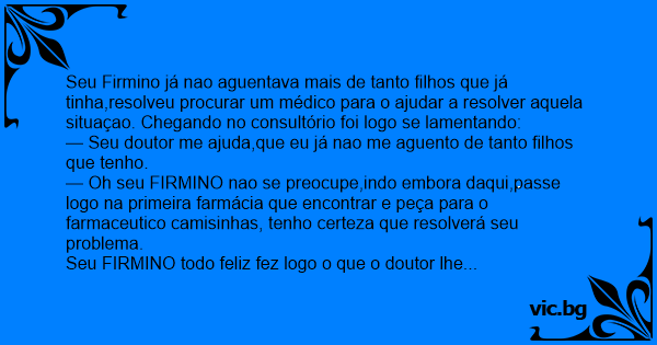 Seu Firmino já nao aguentava mais de tanto filhos que já tinha,resolveu procurar um médico para o ajudar a resolver aquela situaçao. Chegando no consultório foi logo se lamentando: