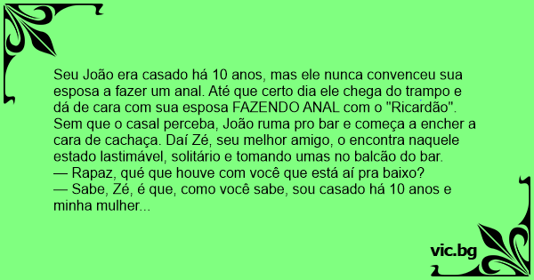 Seu João era casado há 10 anos, mas ele nunca convenceu sua esposa a fazer um аnаl. Até que certo dia ele chega do trampo e dá de cara com sua esposa FAZENDO АNАL com o "Ricardão". Sem que o casal perceba, João ruma pro bar e começa a encher a cara de cachaça. Daí Zé, seu melhor amigo, o encontra naquele estado lastimável, solitário e tomando umas no balcão do bar.