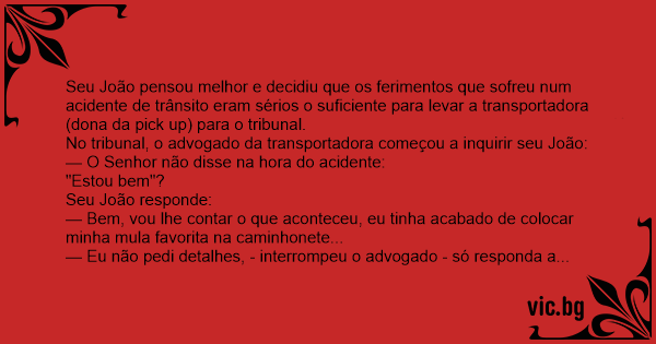 Seu João pensou melhor e decidiu que os ferimentos que sofreu num acidente de trânsito eram sérios o suficiente para levar a transportadora (dona da pick up) para o tribunal.