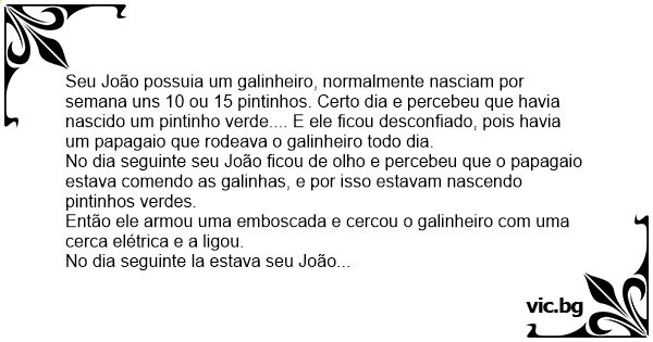 No dia seguinte seu João ficou de olho e percebeu que o papagaio estava comendo as galinhas, e por isso estavam nascendo pintinhos verdes.