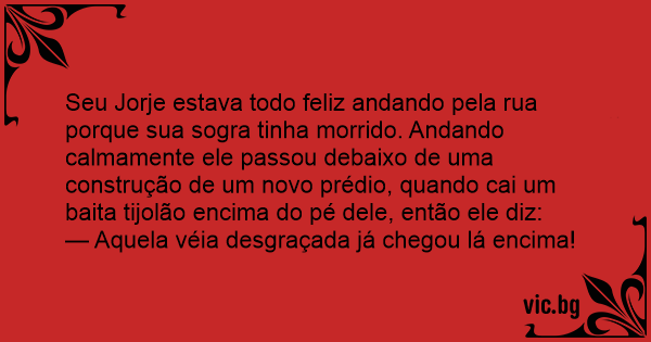 Seu Jorje estava todo feliz andando pela rua porque sua sogra tinha morrido. Andando calmamente ele passou debaixo de uma construção de um novo prédio, quando cai um baita tijolão encima do pé dele, então ele diz: